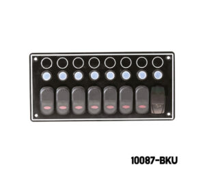 DESCRIPTION • Material: Aluminum panel (black) • Size: 242mm X 114.5mm X 2.5mm • Voltage: 12V • Pre-printed labels included • Cabled with circuit breakers 15A X 8pcs • IP65